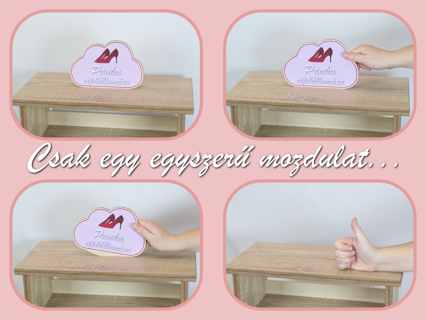 A Cipőállomás egyszerre funkcionális és szerethető. Ez a gyerek cipőtároló kiváló példa arra, hogyan lehet egy bútor egyszerre praktikus és játékos. A Cipőállomás felhő alakú névtáblája kivehető, így a bútor kényelmes ülőfelületként is használható, ami nagy segítség a reggeli készülődésnél.